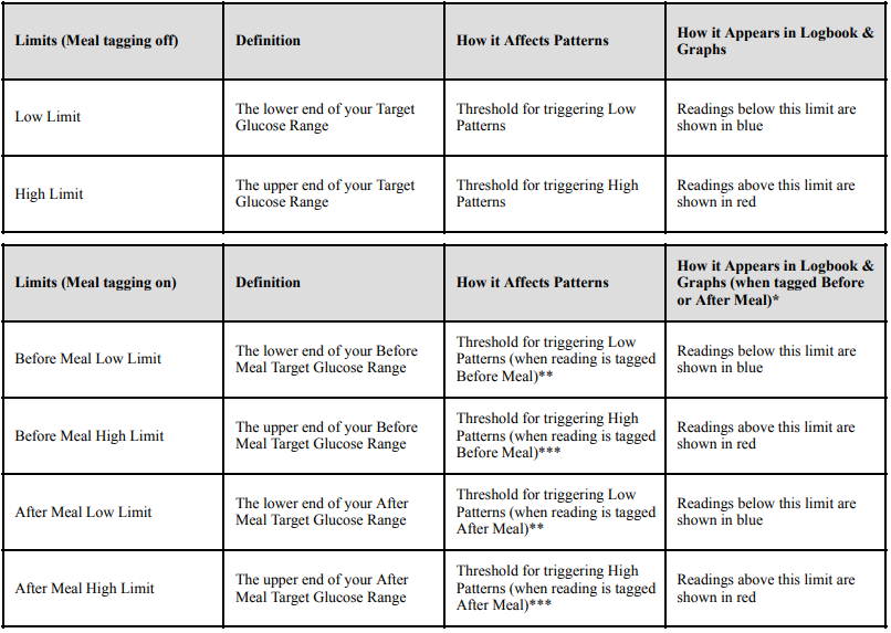 - *** For untagged readings, the higher of the Before or After Meal High Limits is used to detect patterns.